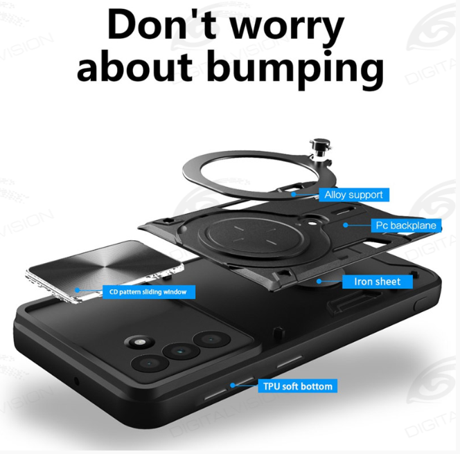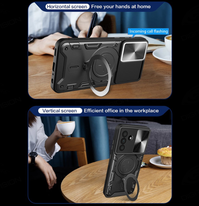 Rotirajući prsten od 360 stepeni: Više od običnog držača. Ugrađeni metalni prsten rotira se pun krug, omogućavajući vam da postavite telefon pod idealnim uglom za gledanje videa, navigaciju ili video pozive, potpuno bez upotrebe ruku. Takođe služi kao siguran držač (ring holder) za prst kako bi sprečio ispadanje telefona.