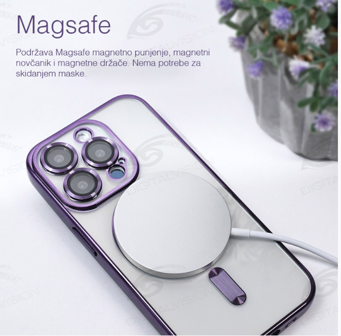 Providna silikonska maska sa ugrađenim zaštitnim staklom za kameru. Na poleđini se nalaze magneti za magsafe punjenje. Napravljena je od kvalitetnog fleksibilnog silikona.
